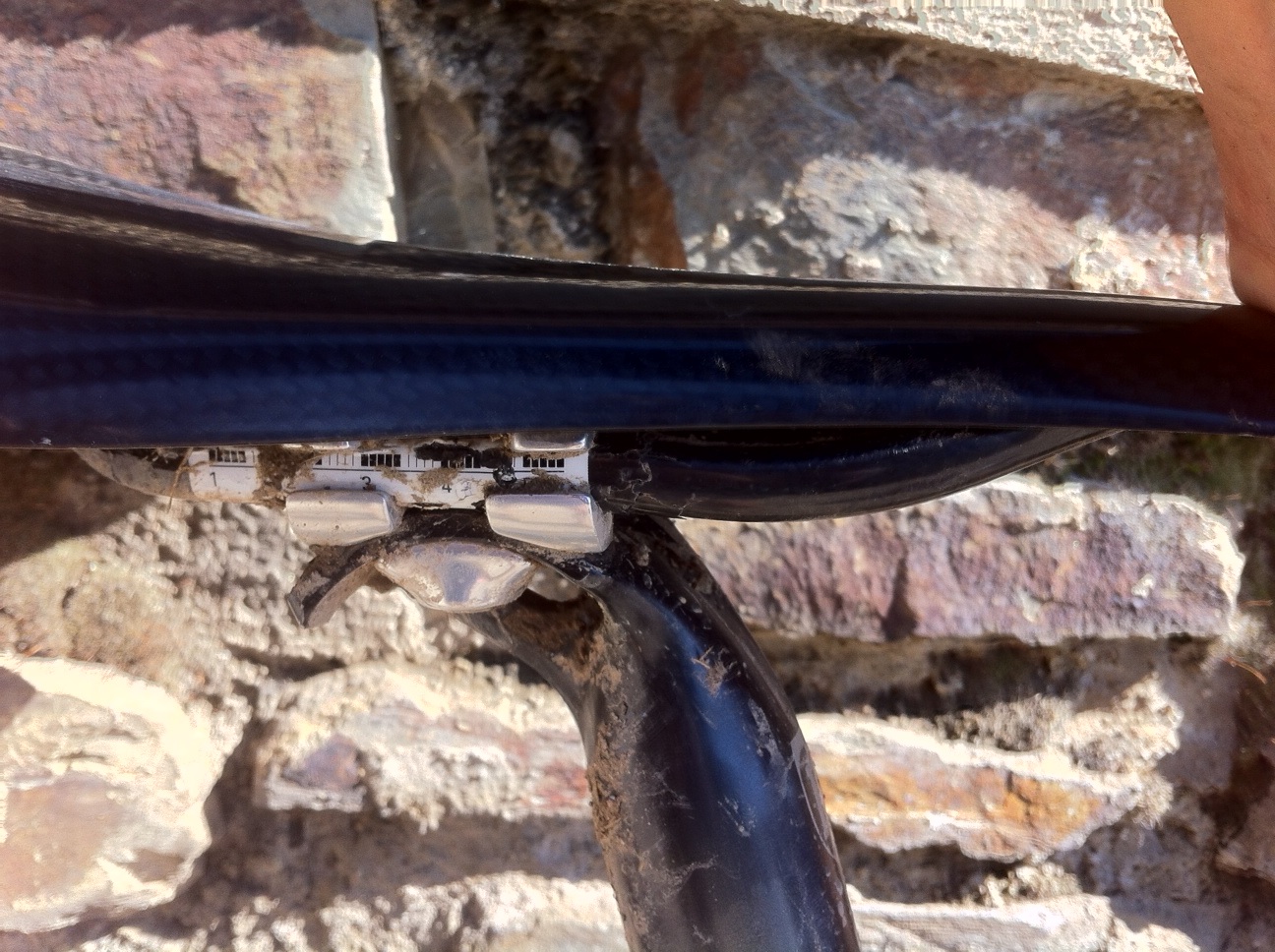 En un tram de baixada de Beixèc a Hostal nou, m'atrapa el tercer, el Jordi Temporal, amb el pressing i volent correr més del compte em menjo una arrel en diagonal i directe a terra a més de 35 per hora. Cop molt fort a l'espatlla, rascades a cadera i genoll, seient trencat, manillar girat i maneta del frè totalement doblegada. La fava ha estat important, doncs trigo a reaccionar. mig adolorit i atontat "reparo" la bici com puc i pujo a la bici a veure que tal.. evidentment si ja baixava fatal, doncs ara pitjor.. al final de la baixada passem de nou per Martinet prop del cotxe.. temptacions de plegar i a més m'atrapen el Siscu i l'Edu Ginestà.. al pedalar em fa molt mal la cama.